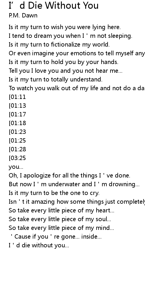 | [03:31][03:25][03:20][01:43][01:37][01:31] | Cause inside I d die without you... |
