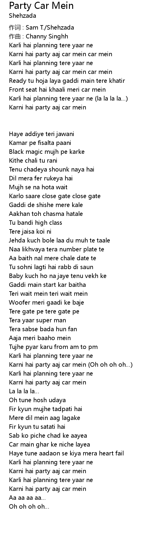 | Karni hai party aaj car mein Oh oh oh oh | |