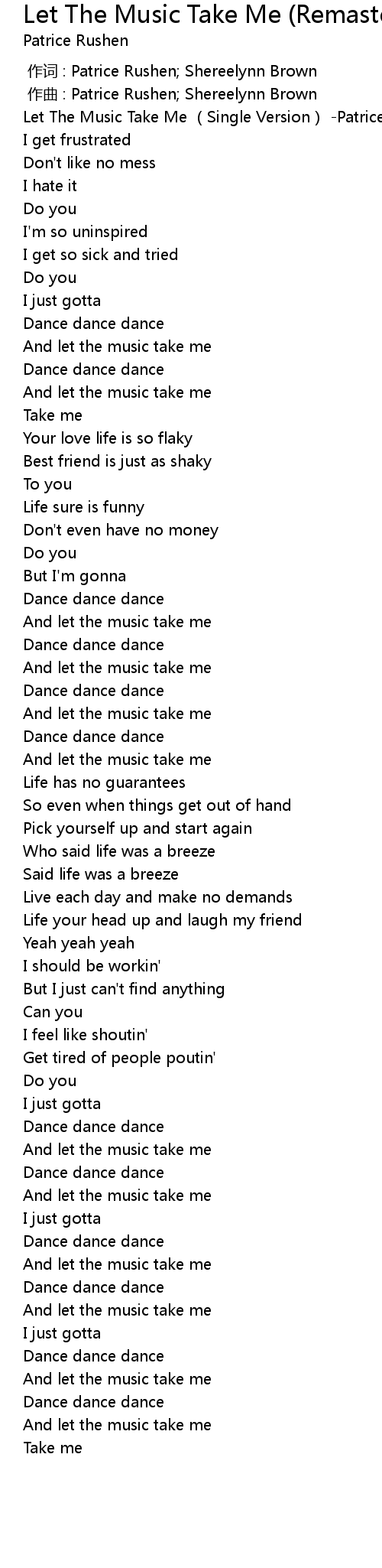 | [00:00.00] | Let The Music Take Me Single Version Patrice Rushen |