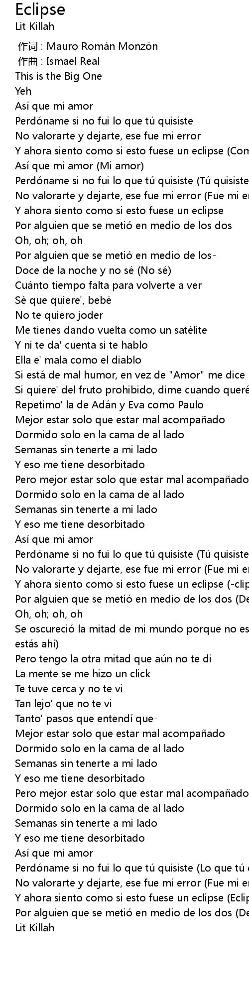 | [00:22.29] | Y ahora siento como si esto fuese un eclipse (Como un eclipse) |
