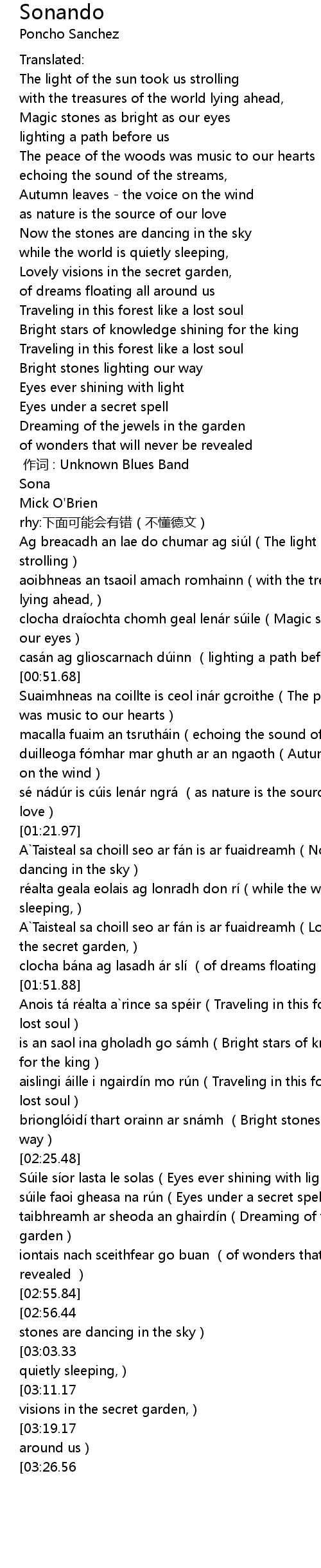 | [01:22.26] | A Taisteal sa choill seo ar fá n is ar fuaidreamh Now the stones are dancing in the sky |
