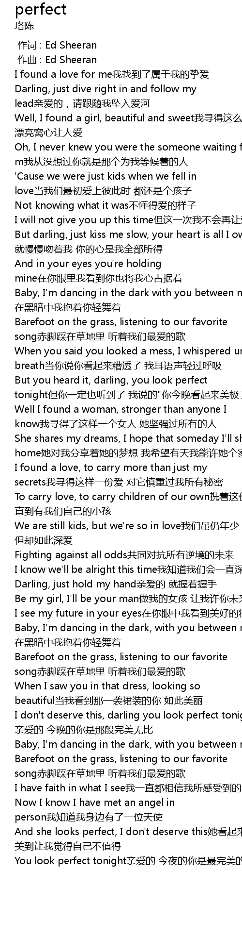 | [04:02.66] | You look perfect tonight qīn ài de jīn yè de nǐ shì zuì wán měi dí |