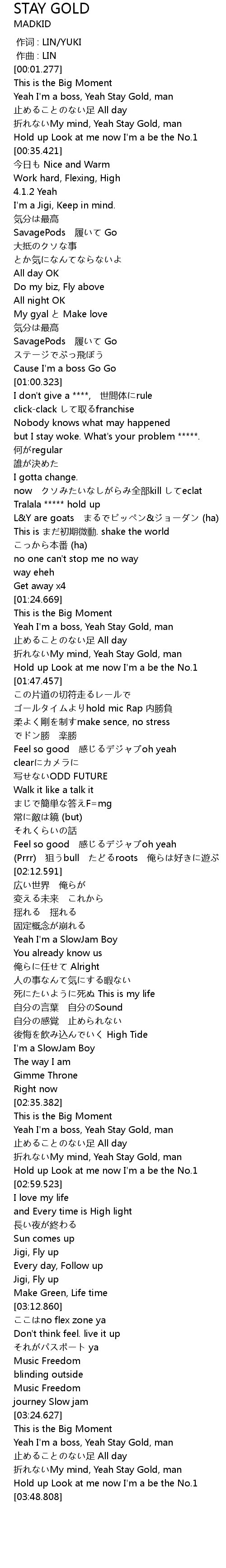 | [01:26.662] | Yeah I' m a boss, Yeah Stay Gold, man |