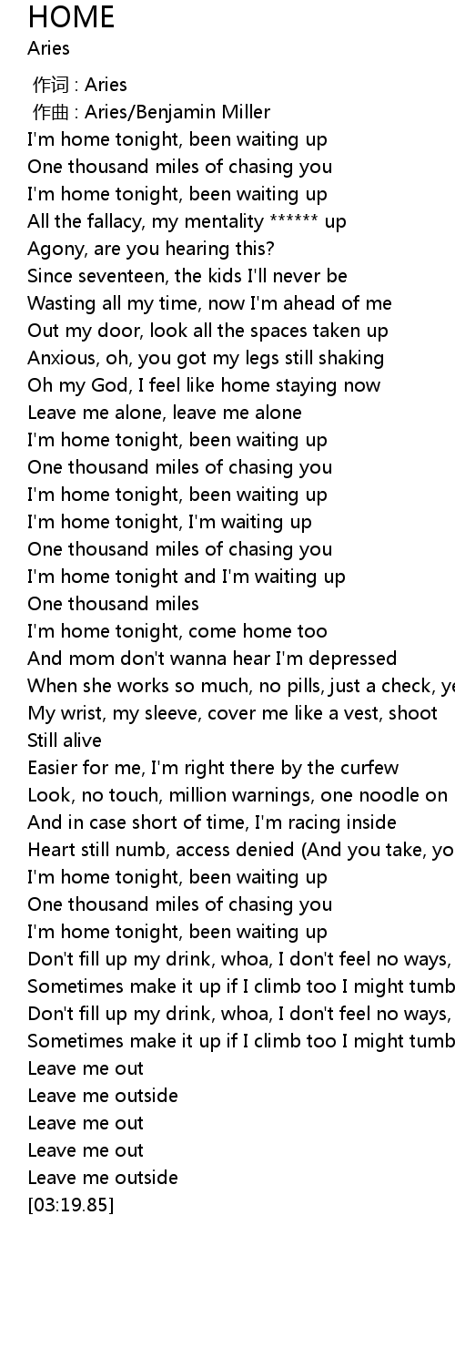 | [00:58.43] | I' m home tonight, been waiting up |