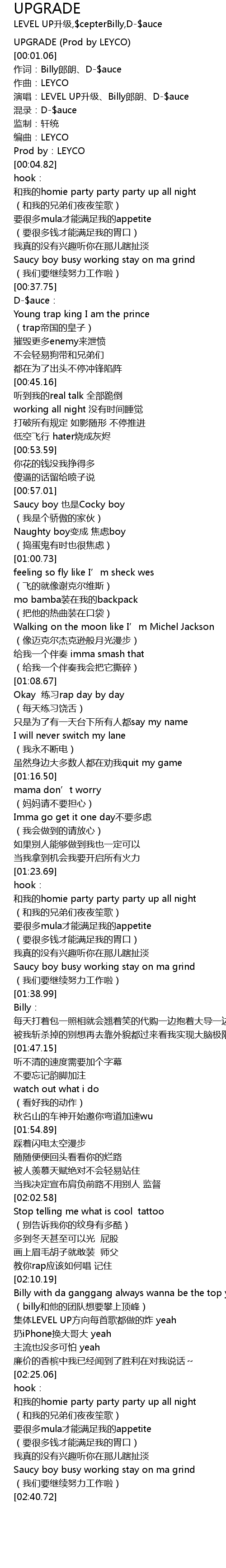 | [00:02.41] | 演唱:LEVEL UP升级、Billy郎朗、D-$auce |