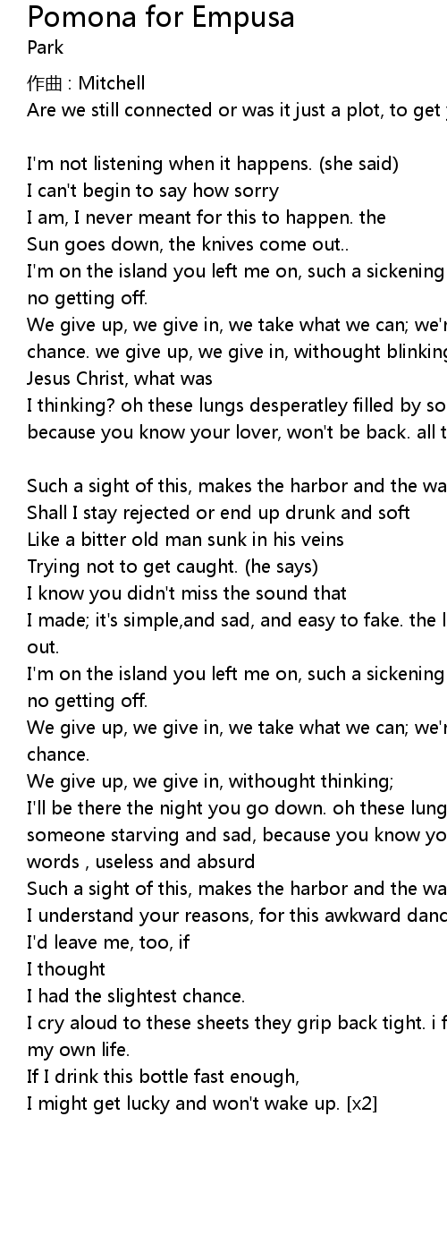 | I' ll be there the night you go down. oh these lungs desperatley filled by someone starving and sad, because you know your lover, won' t be back. all these words , useless and absurd | |