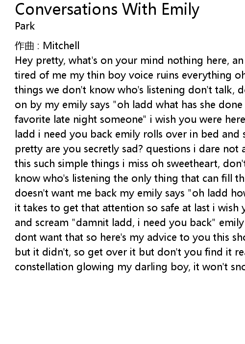 | Hey pretty, what' s on your mind nothing here, an endless night fed up and sick, tired of me my thin boy voice ruins everything oh sweetheart, don' t say such things we don' t know who' s listening don' t talk, don' t smile just silently walk on by my emily says " oh ladd what has she done to my darling innocent boy? my favorite late night someone" i wish you were here to kiss me and scream damnit ladd i need you back emily rolls over in bed and says " is it really so bad?" hey pretty are you secretly sad? questions i dare not ask fed up and sick, tired of this such simple things i miss oh sweetheart, don' t say such things we don' t know who' s listening the only thing that can fill this gap is the one who doesn' t want me back my emily says " oh ladd how long can this last?" as long as it takes to get that attention so safe at last i wish you were here to hold me and scream " damnit ladd, i need you back" emily rolls over in bed and says " you dont want that so here' s my advice to you this should' ve turned out different but it didn' t, so get over it but don' t you find it reassuring? that one constellation glowing my darling boy, it won' t snow where she is going" |