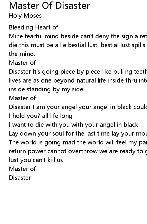 Disaster It's going piece by piece like pulling teeth the anger has begun our lives are as one beyond natural life inside thru internal strife bloody animal inside standing by my side |
