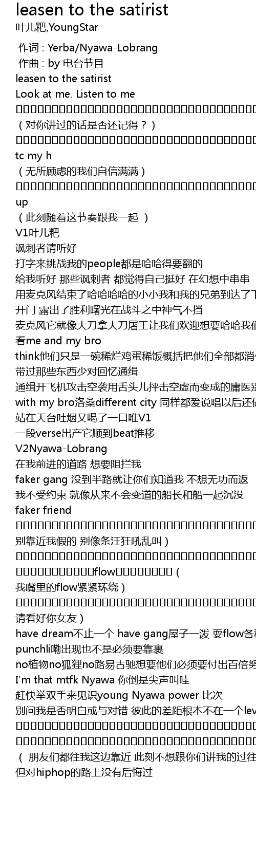 | [01:58.972] | I' m that mtfk Nyawa nǐ dǎo shì jiān shēng jiào wa gǎn kuài jǔ shuāng shǒu lái jiàn shí young Nyawa power bǐ cì bié wèn wǒ shì fǒu míng bái huò yǔ duì cuò bǐ cǐ de chā jù gēn běn bù zài yí gè level hold up hiphop. péng yǒu men dōu wǎng wǒ zhè biān kào jìn cǐ kè bù xiǎng gēn nǐ men jiǎng wǒ de guò wǎng rú hé dàn duì hiphop de lù shàng méi yǒu hòu huǐ guò |