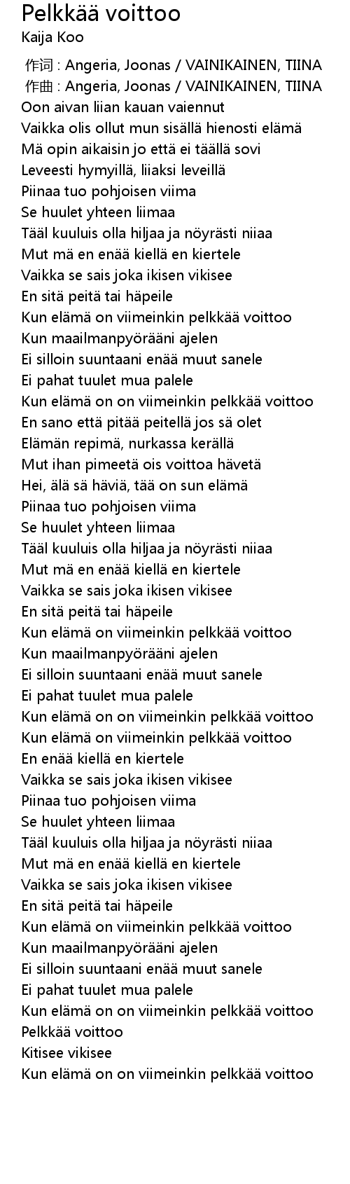 | [00:50.31] | Kun el m on viimeinkin pelkk voittoo |