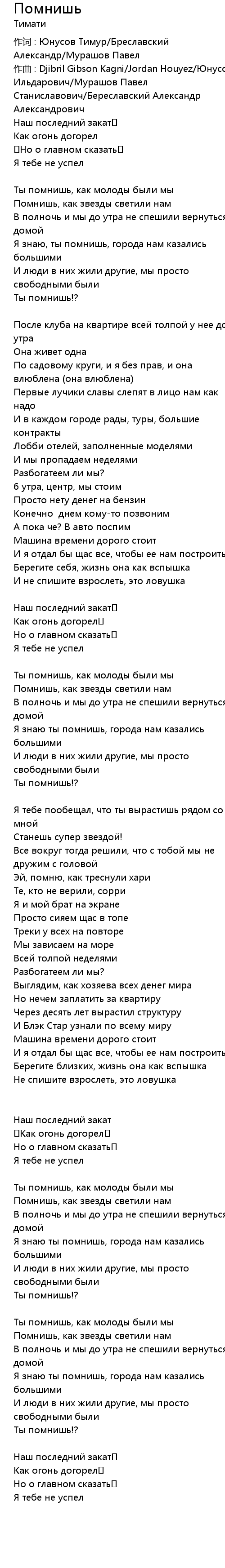 作词 : Юнусов Тимур/Бреславский Александр/Мурашов Павел |