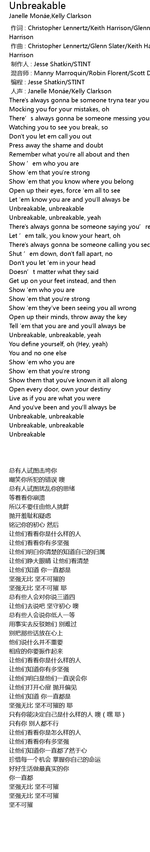 | [02:03.53] | Unbreakable, unbreakable, yeah |