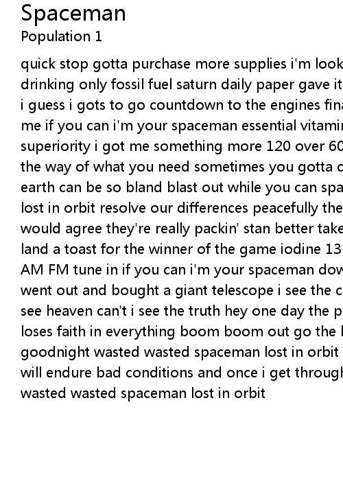 quick stop gotta purchase more supplies i'm looking to myself to vitalize i'm drinking only fossil fuel saturn daily paper gave it rave reviews countdown well i guess i gots to go countdown to the engines final blow light speed i am catch me if you can i'm your spaceman essential vitamins are just a tease nutritional superiority i got me something more 120 over 60 is a total bore stop standing in the way of what you need sometimes you gotta cut yourself to feel what's real earth can be so bland blast out while you can spaceman wasted wasted spaceman lost in orbit resolve our differences peacefully the billion people of india would agree they're really packin' stan better take the challenge this is sacred land a toast for the winner of the game iodine 131 champagne