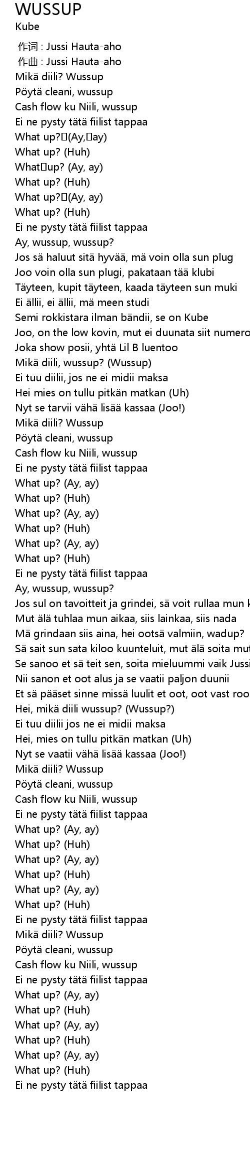| [01:03.36] | Mikä diili, wussup? (Wussup) |