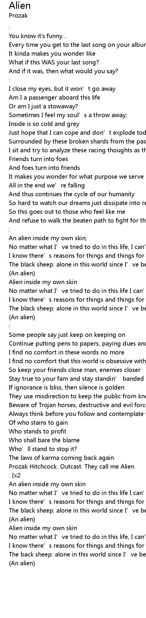 | Prozak Hitchcock. Outcast. They call me Alien | |