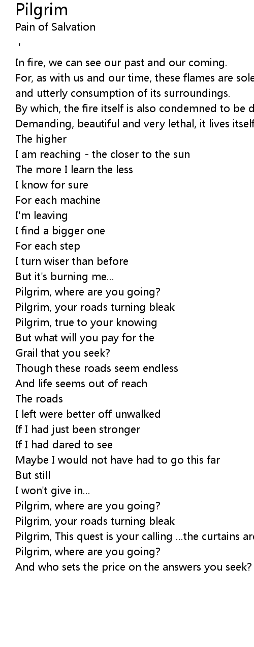 Pilgrim, This quest is your calling ...the curtains are falling... |