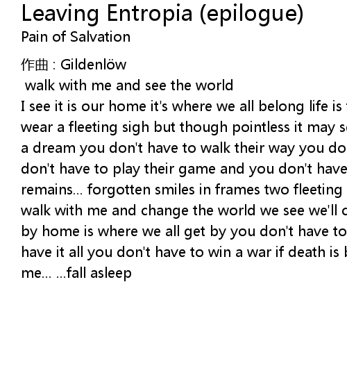 | I see it is our home it' s where we all belong life is flair a brittle dress we wear a fleeting sigh but though pointless it may seem... live as death were but a dream you don' t have to walk their way you don' t have to watch the show you don' t have to play their game and you don' t have to die to leave entropia all remains... forgotten smiles in frames two fleeting lives cut down to pocketsize walk with me and change the world we see we' ll cease to be just people passing by home is where we all get by you don' t have to cry for more you don' t have to have it all you don' t have to win a war if death is but a dream then don' t let me... ... fall asleep |