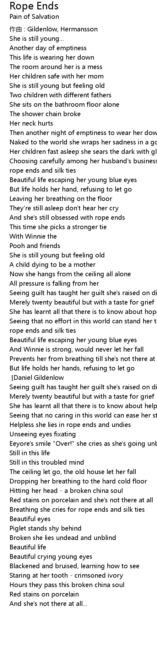 | Breathing she cries for rope ends and silk ties | |