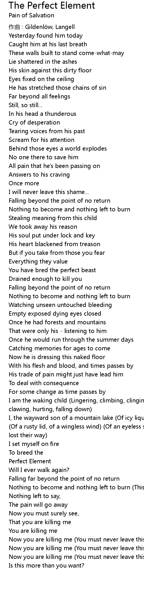 | I am the waking child Lingering, climbing, clinging, clutching Craving, clawing, hurting, falling down | |
