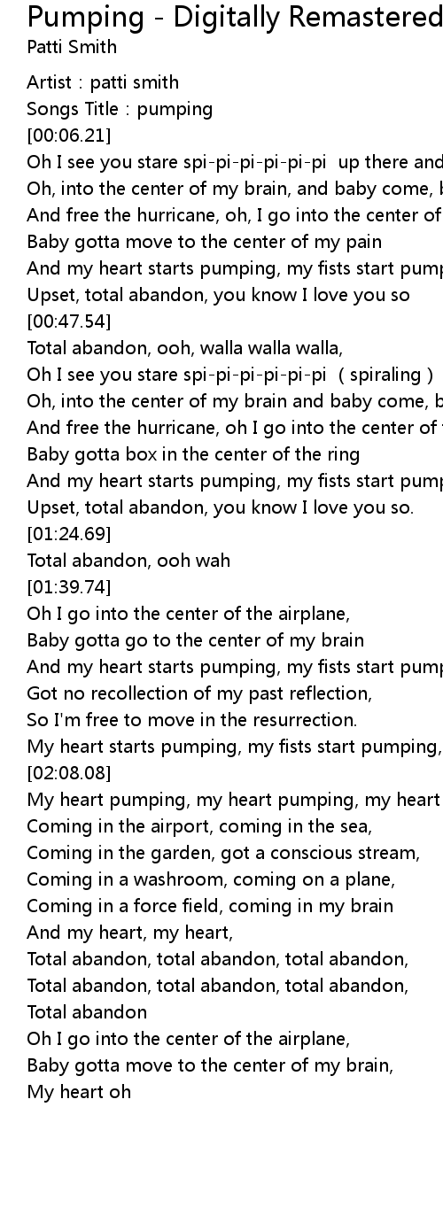 | [02:13.70] | My heart pumping, my heart pumping, my heart pumping |