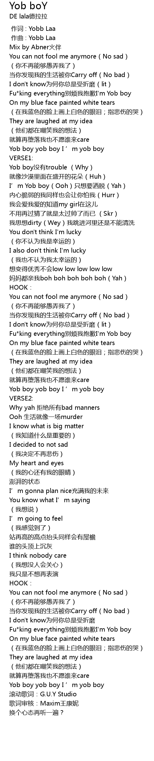 | [01:30.443] | Yob boy yob boy I ' m yob boy |