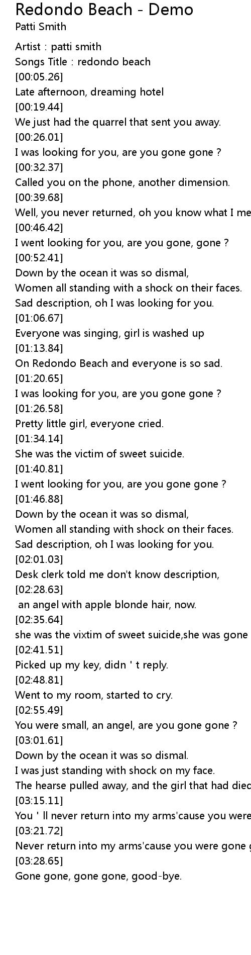 | [01:15.03] | On Redondo Beach and everyone is so sad. |