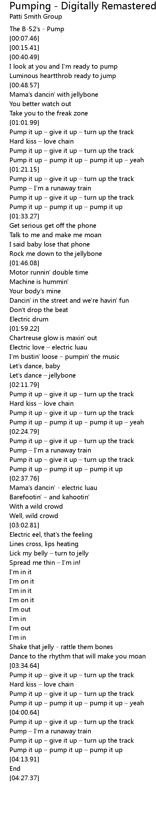 | [02:34.73] | Pump it up – pump it up – pump it up |