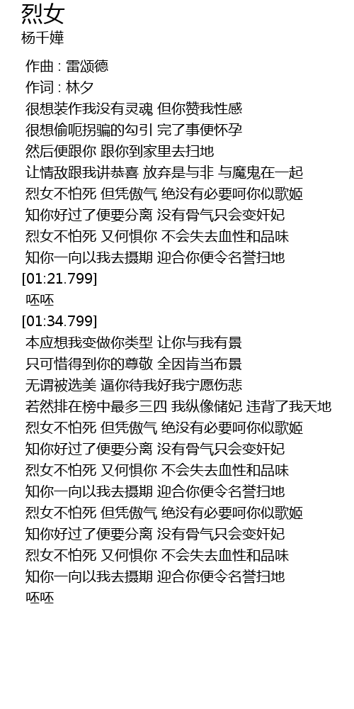 | [02:24.999] | 烈女不怕死 又何惧你 不会失去血性和品味 |