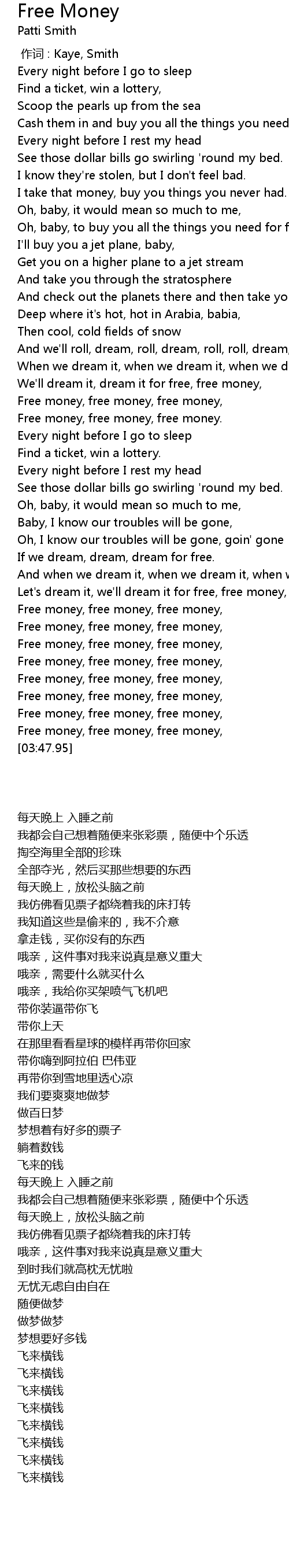 | [03:15.90] | Let' s dream it, we' ll dream it for free, free money, |