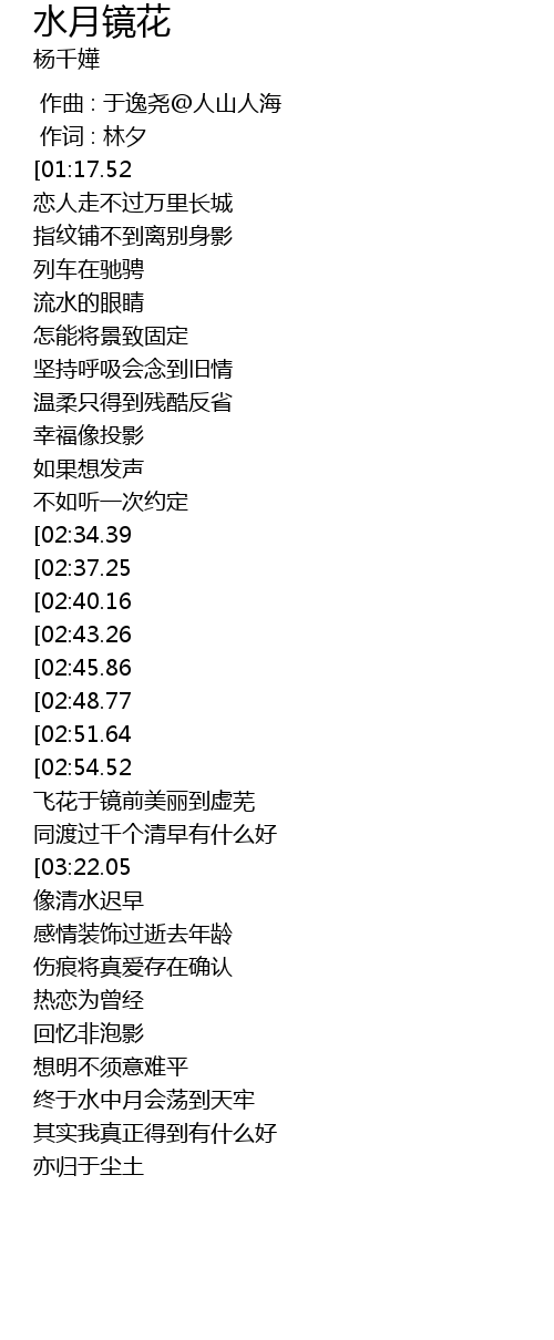 | [00:00.00][01:17.52][01:49.15][03:00.61][03:32.70] | 杨千�-水月镜花(粤) |
