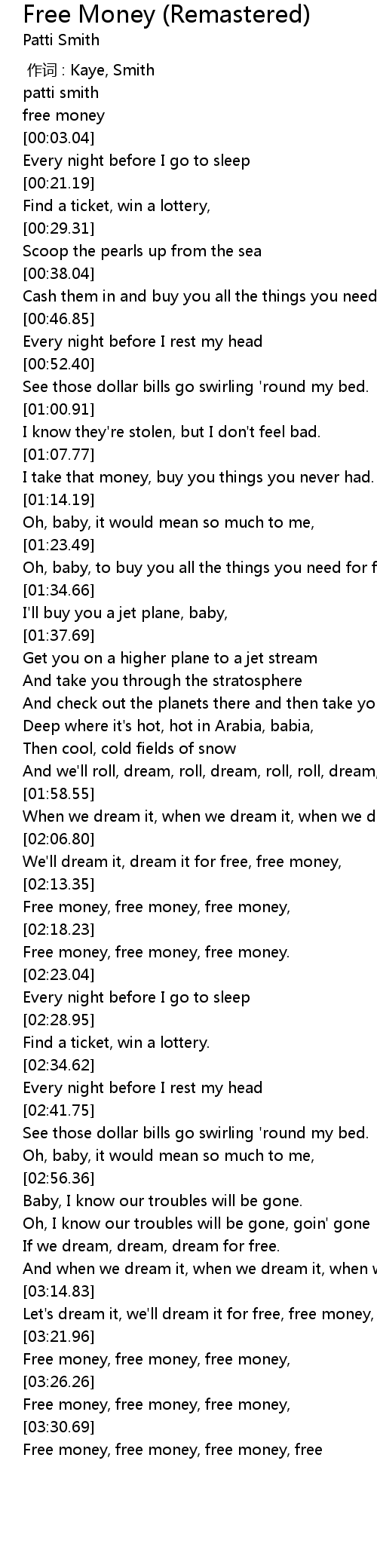 | [03:16.96] | Let' s dream it, we' ll dream it for free, free money, |