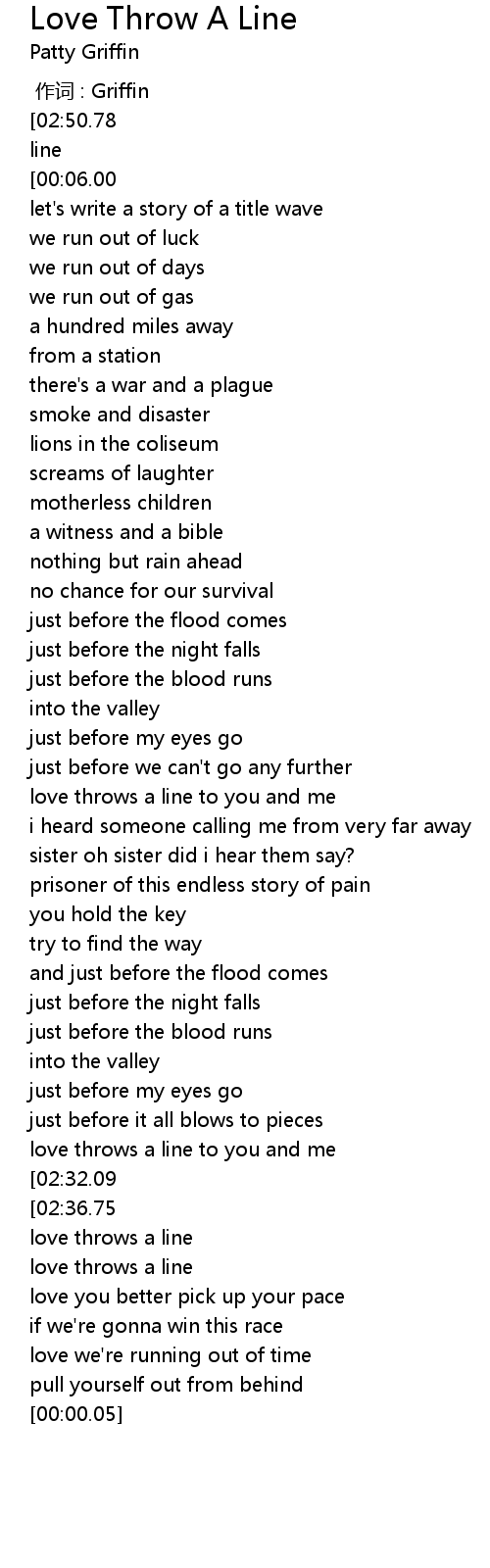 | [03:19.72][02:50.78][02:23.90][01:28.28][00:00.00] | patty griffin love throw a line |