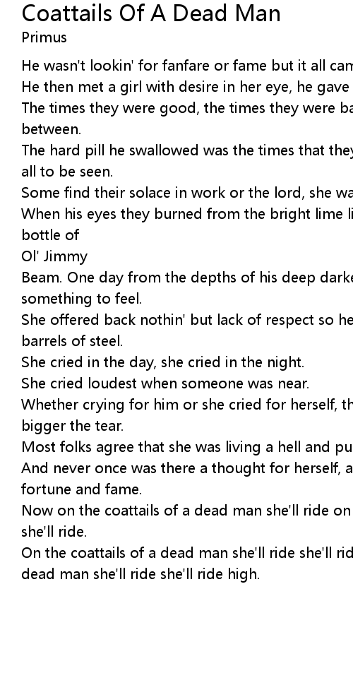 | Now on the coattails of a dead man she'll ride on the coattails of a dead man she'll ride. | |