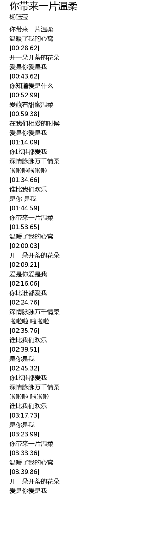 | [03:26.99] | ni dai lai yi pian wen rou |