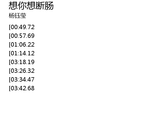 | [02:04.10][00:57.69][00:24.61] | 想你想断肠 |