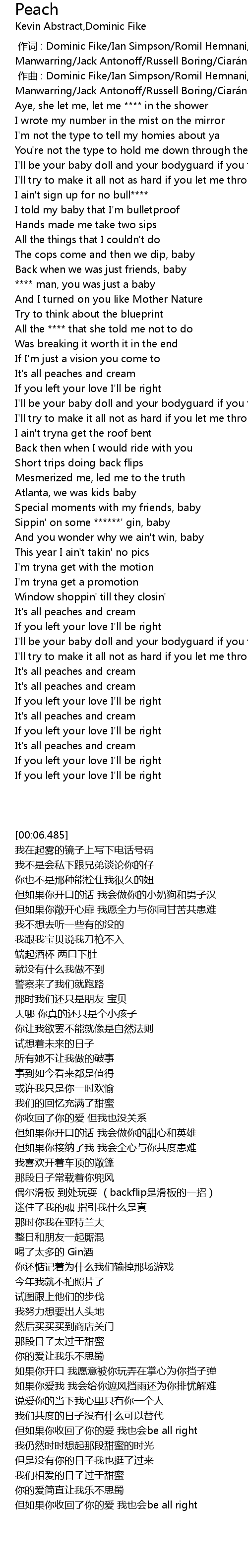 | [00:06.485] | Aye, she let me, let me in the shower |
