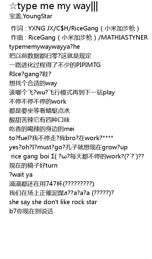 | [00:00.000] | 作词 : YXNG JX/C$H/RiceGang(小米加步枪) |