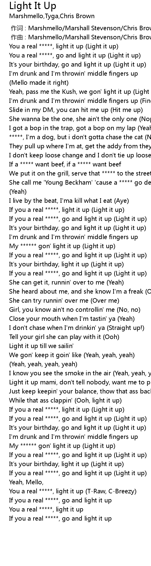 | [00:50.17] | If you a real *****, go and light it up (Light it up) |