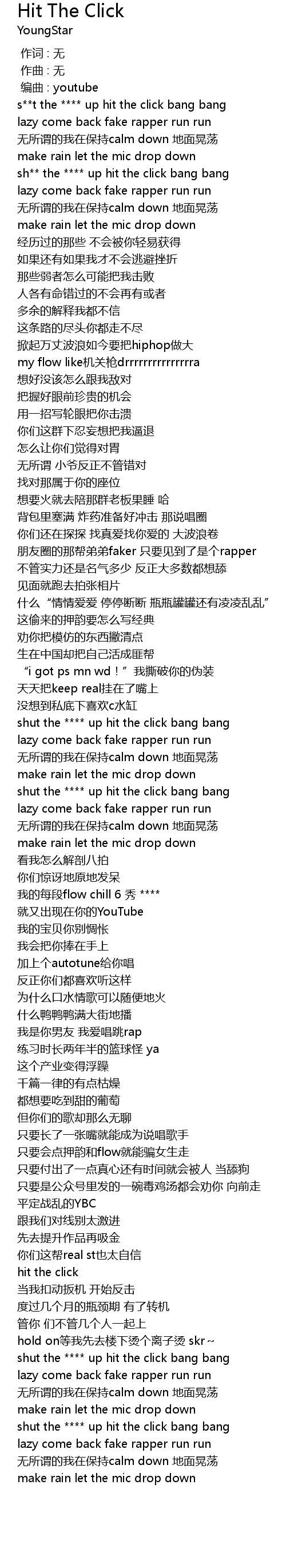 | [00:13.182] | s**t the **** up hit the click bang bang |