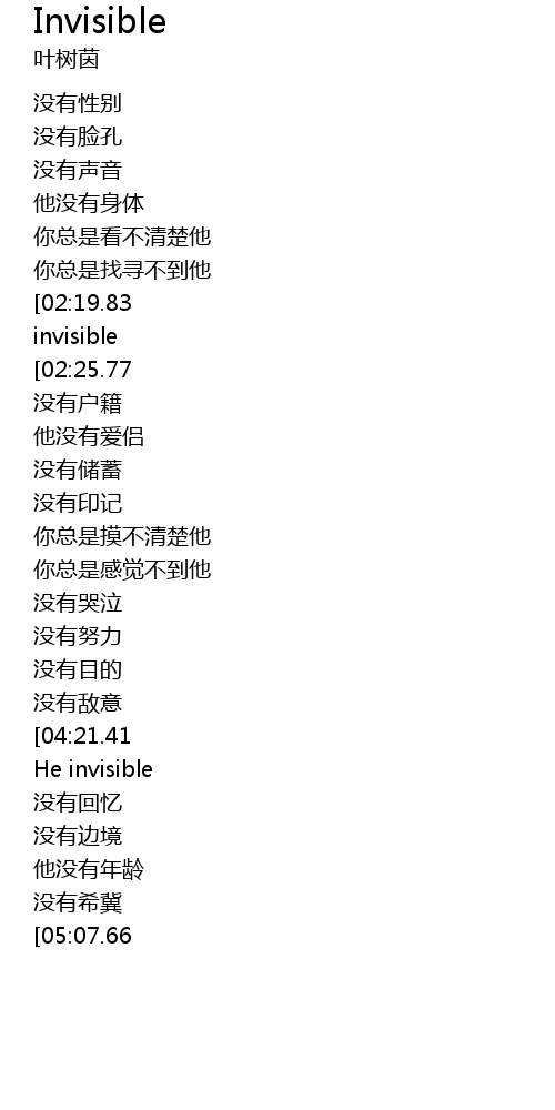 | [02:14.18][02:25.77][03:23.55][03:35.06] | he's invisible |