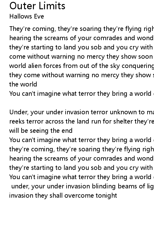 You can't imagine what terror they bring a world gone mad where bedlam is king [Chorus] under, your under invasion blinding beams of light under, your under invasion they shall overcome tonight |