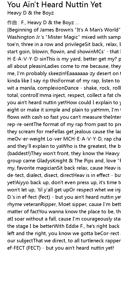 | [Beginning of James Brown's "It's A Man's World" plays then switches toGrover Washington Jr.'s "Mister Magic" mixed with samples of Lyn Collin'sTic-tac, toe'n, three in a row and privilegeSit back, relax, listen to a pro andAs I start goin, blowin, flowin, and showinMCs' - that I am the capital H-E-A-V-Y-D-sinThis is my yard, better get my? preason?No discontent cause I'm all about pleasinLadies come to me because, they love squeezinIf you don't see me, I'm probably skeezin!Eaaaaaaa-zy desert on the smooth tipAs I get loose, kinda like I say rip thisFormat of my rap, listen to directionSix foot three, wit a manila, complexionDance - shake, rock, rollHeav is in the house I got total, controlI'mma inject, respect, collect a fat checkHeav is in effect - but you ain't heard nuttin yet!How could I explain to ya - the HeavmaniaTryna figure eight or make it simple and plain to yaHmm, I'm the Heavster, a rap registerThat flows with cash so fast you can't measure theIntent of content that I rep-re-sentThe format of my rap from past to present tenseGirls they adore me, they scream for meFellas get jealous cause the ladies won't ignore meOv-er-weight Lo-ver MCH-E-A-V-Y-D, rap championJoe Black, Pete Rock, Billy Bob and they'll explain to yaWho is the greatest, the biggest, the baddest! (baddest!)They won't front, they know the Heavy D. statusMy favorite, old time group came GladysKnight & The Pips and, love "Flip" WilsonThe Great Houdini was my, favorite magicianSit back relax, cause Heav is on a missionI'mma inject, de-tect, dialect, disect, directHeav is in effect - but you ain't heard nuttin yet!Aiyyo back up, don't even press up, it's time to set upThe staaage, and I won't let up, 'til y'all get upOr respect whet we inject, so come correctHeavy D.'s in ef-fect (fect) - but you ain't heard nuttin yet!Wreaka, no half-stepper, rhyme veteranRipper, Moet sipper, cause I'm better inThis hand, even that and, a matter of factYou wanna know the place to be, the place to be is where Heavy's atI soar without a fall, cause I'm courageously standingI'm in demand, and on the stage I be betterWith Eddie F., he's right back at meThe Boyz are to the left and the right, you know we gotta beCor-rect as we expect, you too accept our subjectThat we direct, to all turtleneck rappers who seem upsetHeavy D.'s in ef-FECT (FECT) - but you ain't heard nuttin yet! |