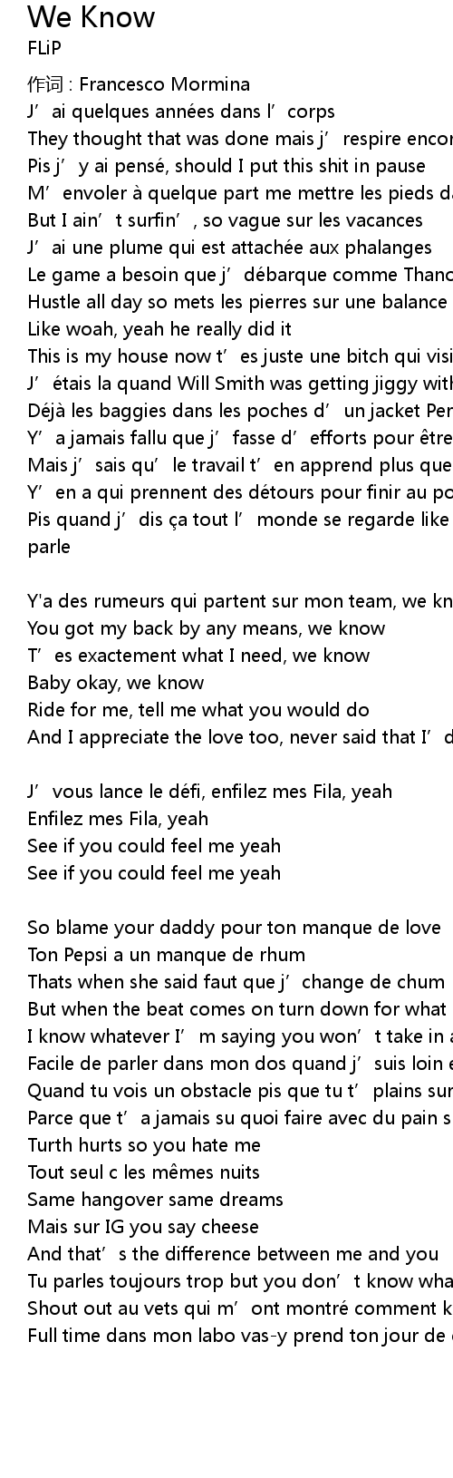 | Pis quand j’dis ça tout l’monde se regarde like on sait pas d’qui il parle | |