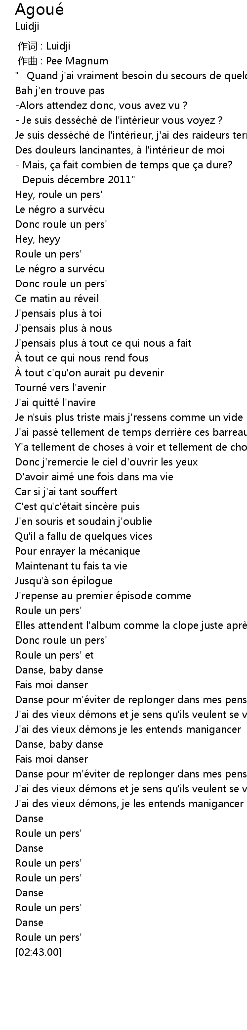 | [02:03.90] | J' ai des vieux de mons et je sens qu' ils veulent se venger |