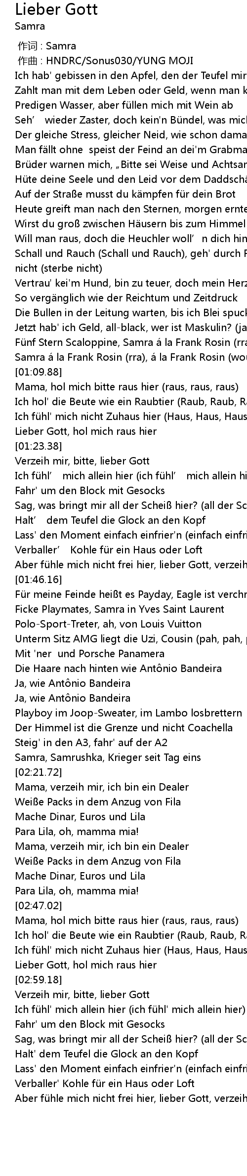 | [02:48.57] | Mama, hol mich bitte raus hier (raus, raus, raus) |