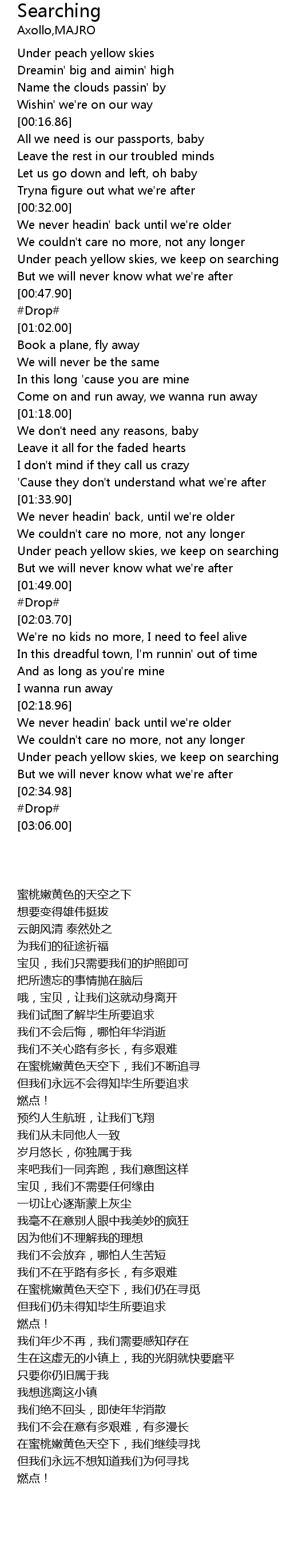 | [00:40.34] | Under peach yellow skies, we keep on searching |