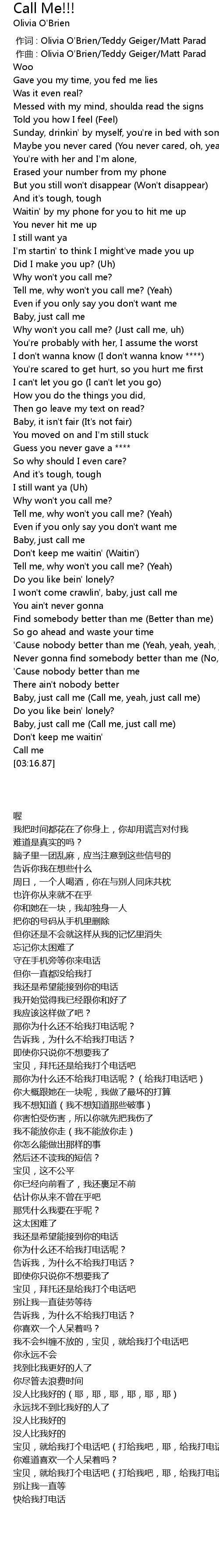 | [00:01.000] | zuò qǔ : Olivia O' Brien Teddy Geiger Matt Parad |
