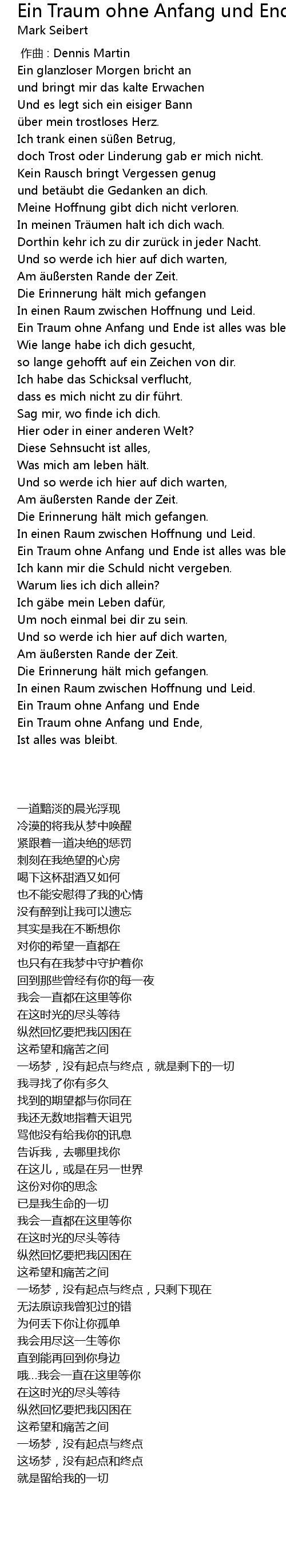 | [02:39.000] | Ein Traum ohne Anfang und Ende ist alles was bleibt. |