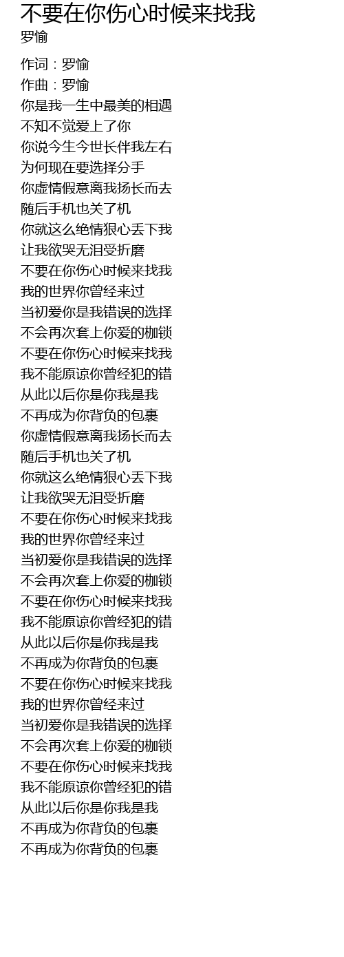 | [02:19.67] | bú yào zài nǐ shāng xīn shí hòu lái zhǎo wǒ |