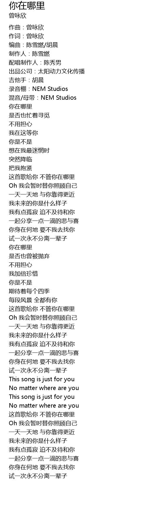 | [01:59.39] | 这首歌给你 不管你在哪里 |